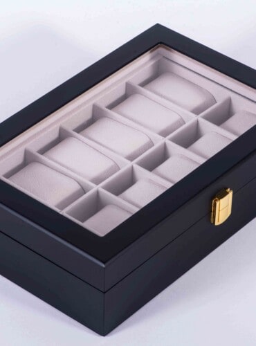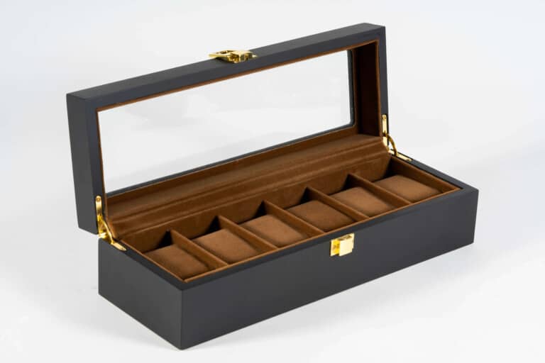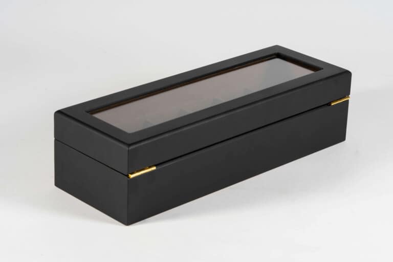 Matt fekete lakkozású óratartó doboz, 6 darab karóra számára.